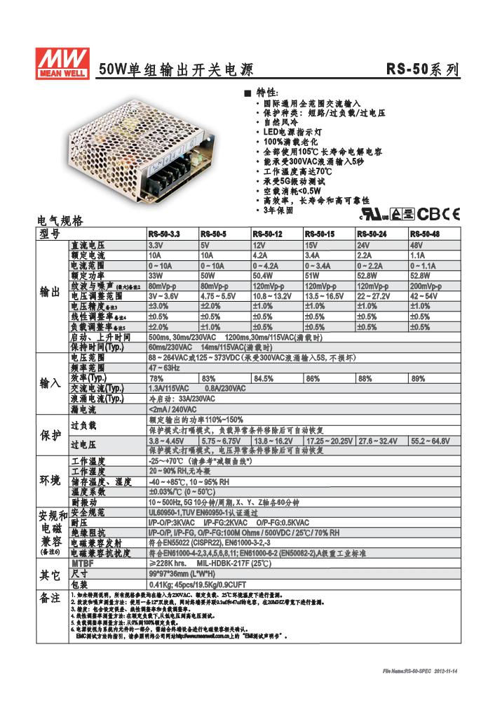 明纬单组输出开关电源RS-50系列RS-50-3.3,RS-50-5,RS-50-12,RS-50-15,RS-5024,RS-50-48