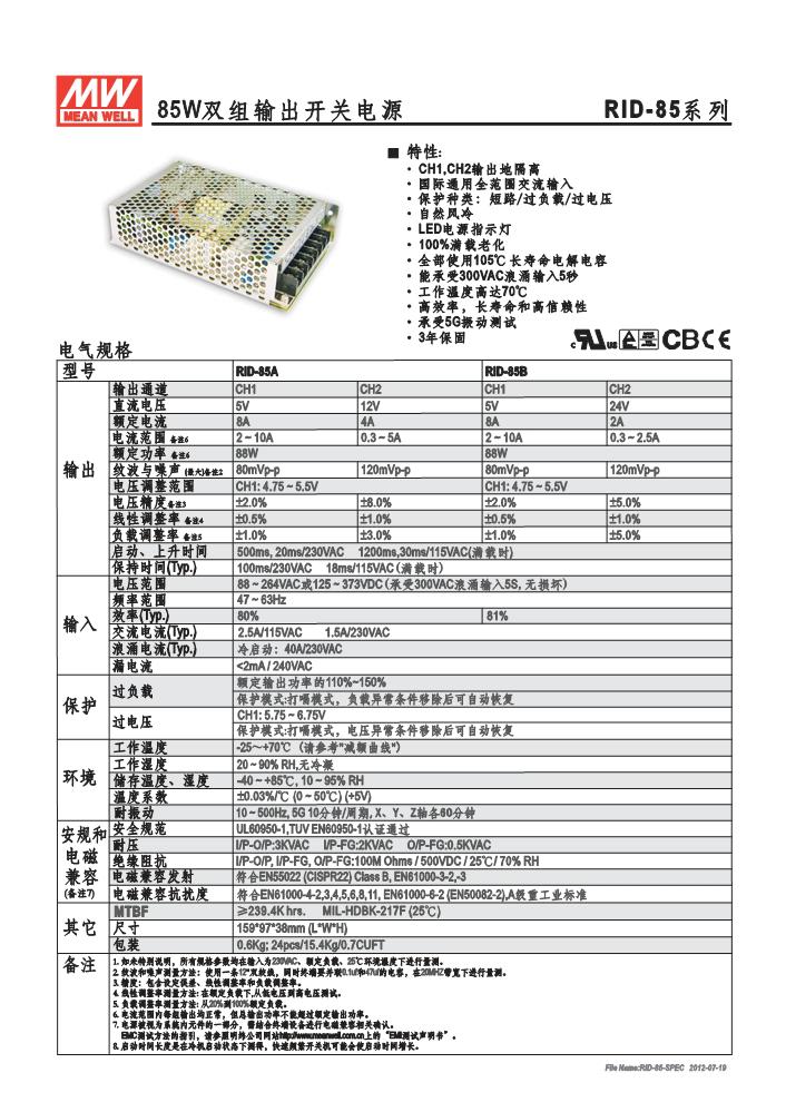 明纬双组输出开关电源RID-85系列 RID-85A,RID-85B