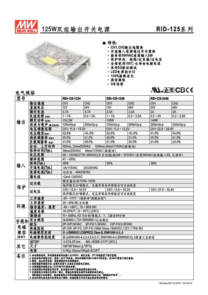 明纬双组输出开关电源RID-125系列 RID-125-1224,RID-125-1248,RID-125-2448