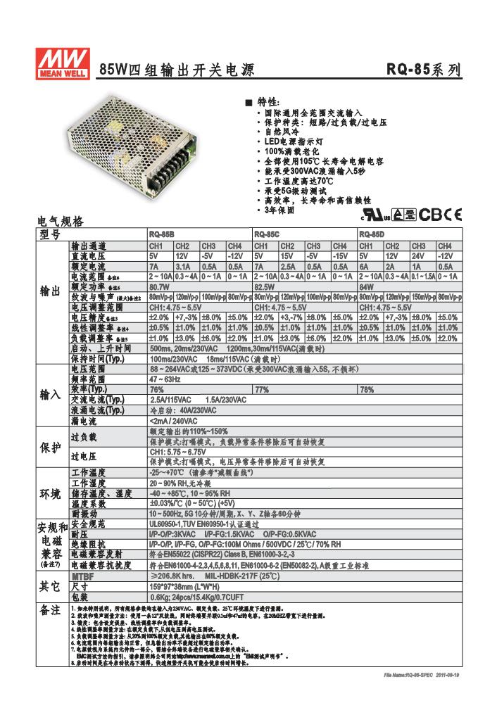 明纬四组输出开关电源RQ-85系列 RQ-85B,RQ-85C,RQ-85D
