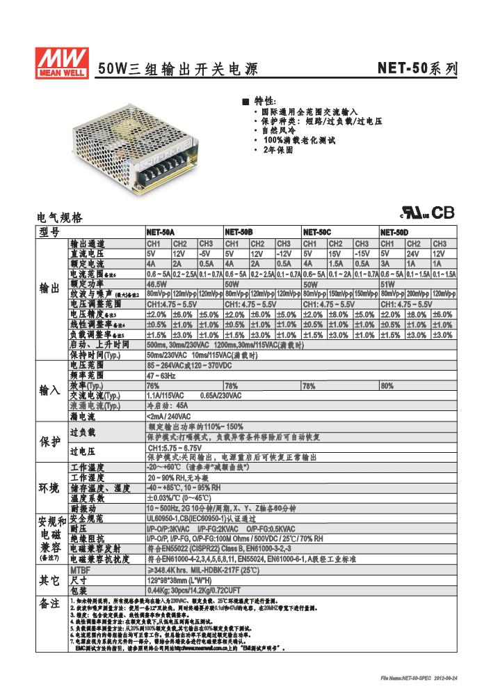 明纬三组输出开关电源NET-50系列NET-50A ,NET-50B,NET-50C ,NET-50D
